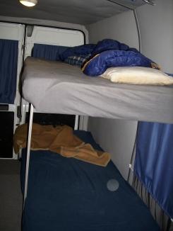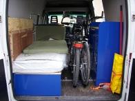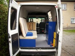 kompletter Eigenausbau mit Küchenschrank mit 1,2l Spülbecken, 14l Abwasserkanister, Kocher- und Gasflaschenaufnahme, 75l Frischwassertank über HA, Doppelstockbett klappbar zur Couch mit 2x 200x80 Liegefläche und riesigem Staufach darunter, Kleiderschrank für 2 verschließbare Plastikboxen wahlweise gegen Doppelsitzbank, 1 Beifahrersitz, 65Ah Aufbaubatterie, 12A-Ladegerät, 600W-WR, LED-komplett, 32l-Kühlschrank, Dachklappe 40x40 mit Ventilator, Isoliert, Porta Potti
