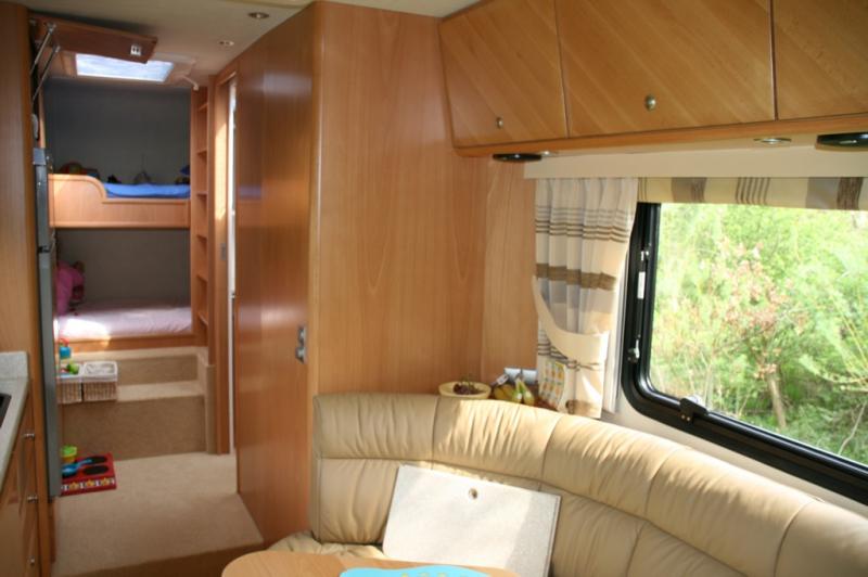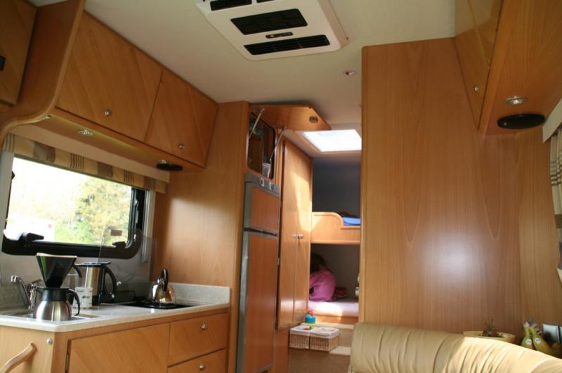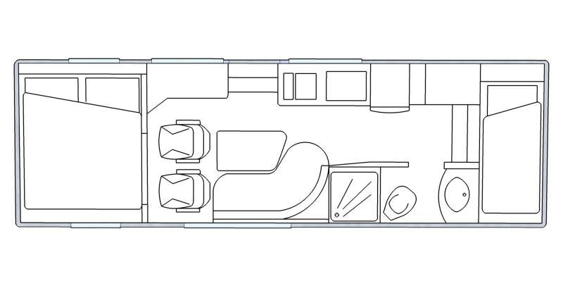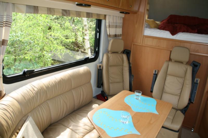 | 2 Einzelsitze drehbar hinter Fahrerhaus, L-Couch, 2 Etagenbetten über Garage | Raumaufteilung (Halbdinette, Stockbetten?) |