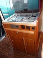 Der Küchenblock bietet neben einem Edelstahlbecken mit fließendem Wasser auch einen zweiflammigen Gaskocher (Dometic). Der Gasvorrat kann selbst für mehrwöchige Touren so auf fünf Liter beschränkt bleiben. Auch Frisch- und Abwasserbehälter sind knapp, aber ausreichend dimensioniert - je 15 Liter. So entfallen aufwändige Unterflurtanks, das Fahrzeug behält seine große Bodenfreiheit.