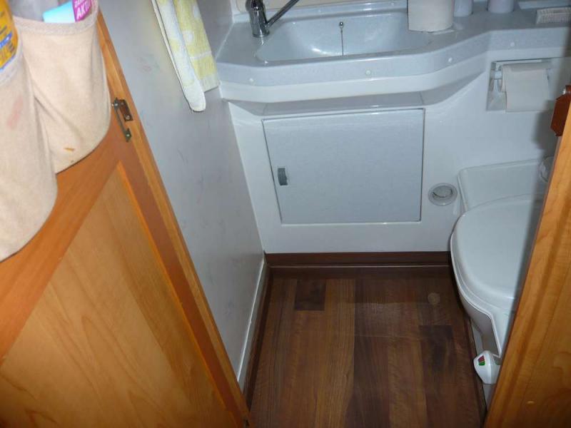 | getrennte Dusche, Badmit WC, Kleiderschrank neben Küche, 3-Flammenherd, 4er Dinette, Alkoven als Schrankversion, jedoch wieder umgeändert zu Schränken (li+re) und einem Schlafplatz 1x2m, doppelter Boden komplett | Raumaufteilung (Halbdinette, Stockbetten?) |