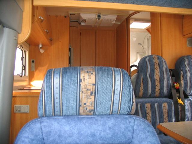 | Sitzecke für 4 Personen hinter Fahrer, daneben Küche, dahinter Bad, im Heck Kleiderschrank | Raumaufteilung (Halbdinette, Stockbetten?) |