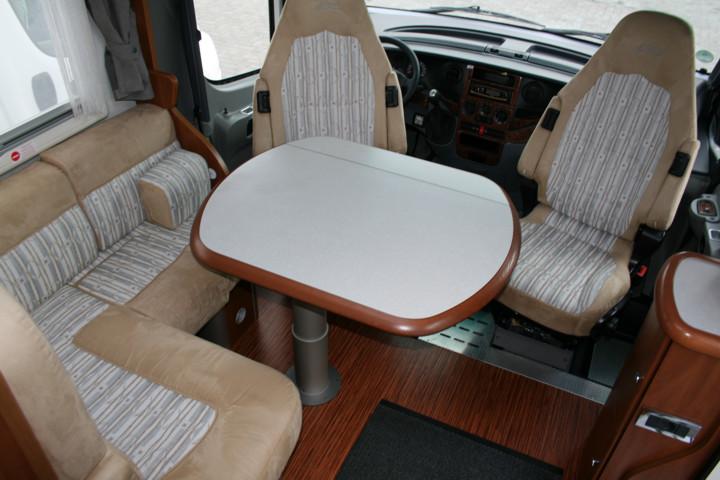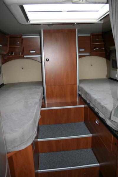 | Halbdinette, 2 Einzelbetten hinten, 1 Doppelklappbett über Fahrer | Raumaufteilung (Halbdinette, Stockbetten?) |