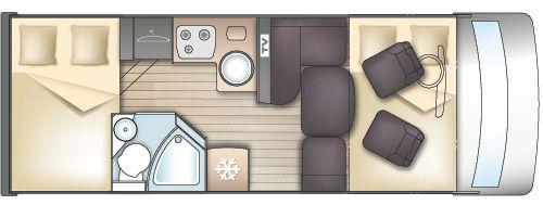 | Vollintegrierter, L Küche, Hubbett, Doppelbett im Heck, Doppelboden, Garage von beiden Seiten | Raumaufteilung (Halbdinette, Stockbetten?) |