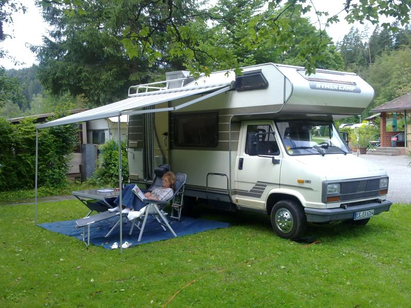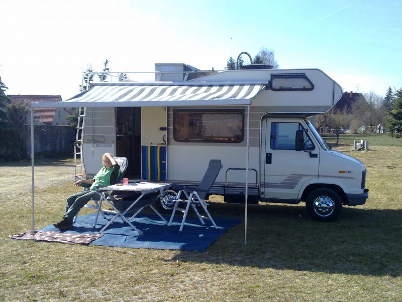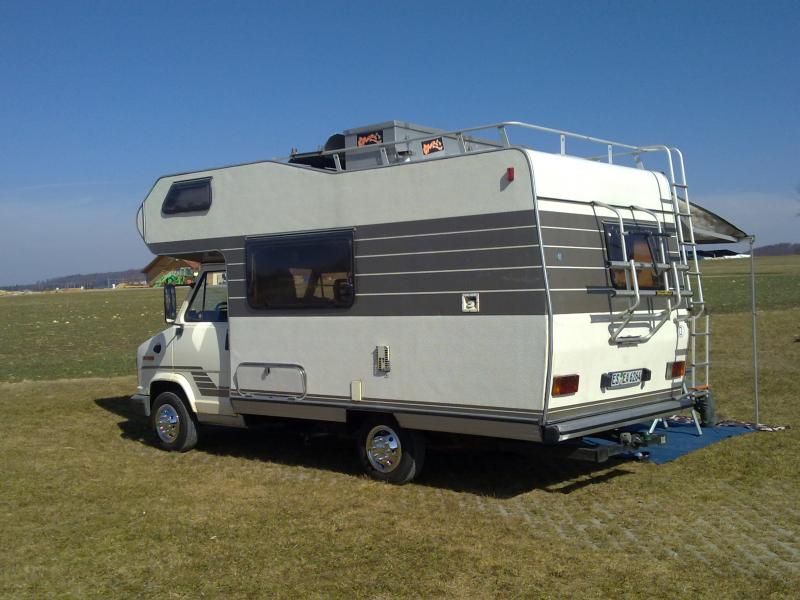 | Unser Womo wurde mit Kat nachgerüstet daher gelbe Plakette. Goldschmitt Luftfederung. Anhängerkupplung. Dachbox. Markise. 2011 aufgemöbelt: Neue Polster, neue Matratze, neue Vorhänge, Neue Aufbaubatterie, neues Ladegerät, manuelle 65er Satschüssel, Receiver und Flat, neuer Bodenbelag. 220V - Wandler, neue Alkovenleiter, Fahrer und Beifahrertüre mit Leder bezogen, Aufbautür neu aufgebaut und mit Leder bezogen (Ist halt auch ein Hobby). Das Womo haben wir im Februar 2011 gekauft und waren seither 17 x damit unterwegs Darunter viele Wochenendtouren. Eine Südfrankreichtour (Zu viert) und eine Tour Ungarn - Österreich. Es hat und nicht im Stich gelassen. | Detailierte Beschreibung Deines Fahrzeuges (Zusatzausstattung, gefahrene Touren, Kilometerleistung, Wintertauglichkeit, bisherige Reparaturen, maximale Anzahl der Mitfahrer, Raumgefühl.....etc) |