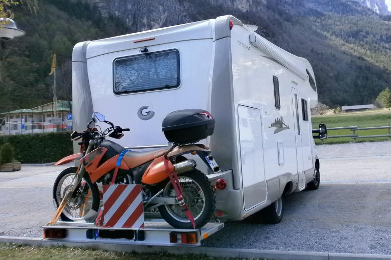Zusatzluftfeder Goldschmitt mit 4,2to Auflastung, Motorradbühne Fiedler 150kg,autom. SAT, 100Wp Solar, Backofen, Markise, Idea Heckgaragen Regal.