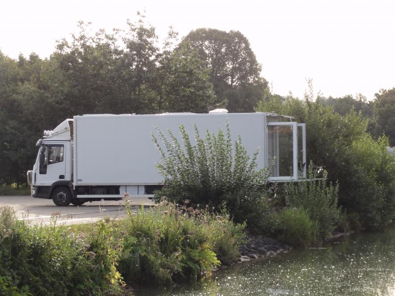 Hinter der Ladeborwand ein großes 2 teiliges Tür-Fenster Termophen- Sicherheitsverglasung. Eingebauter Rolladenkasten 24V , Rollo-Insektenschutz im Fensterrahmen. Ladebordwand von innen und außen bedienbar . Maße (LxB) 1,80 x 2,45m. Verwendung als Balkon ( Sonnendeck)