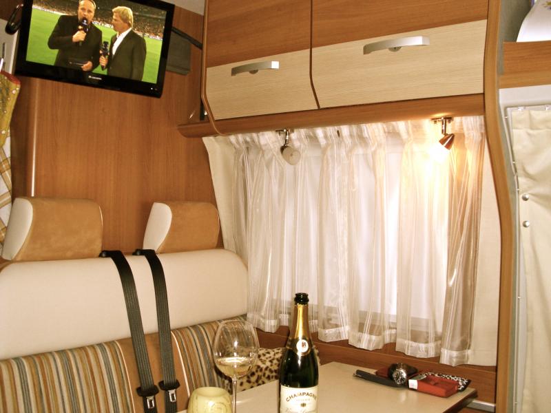 Chassis-Packet, Basic-Paket, Sonderlackierung Champagner, Lederlenkrad, Lammfellbezüge, Umbau 2 Einzelbetten zu 1 Doppelbett 2,00 m x 2,20 m, gr. Kühl-Gefrierkombination 141l + 23l Froster, 2. Garagenklappe links, Abwassertank isoliert, Fenster in T-Haube, automat. Satanlage Teleco Flat 65, 19' Flachbild, Omnistor-Markise 3,5 m, 4-fach Fahrradhalter Thule, Radio Pioneer mit DVD und Rückfahrkamera, PDC hinten, Hubstützen, Zusatzschlösser für Fahrer/Beifahrer -u. Aufbautür, LED-Markisenbeleuchtung, Gaswarner, 120 l-Dieseltank, Beifahresitz höhenverstellbar, Duo Control CS
