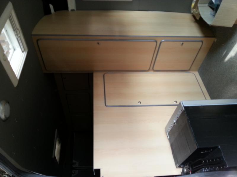 | Heckgarae mit Doppelbett ud vorne Wohnbereich mit Küchenzeile | Raumaufteilung (Halbdinette, Stockbetten?) |