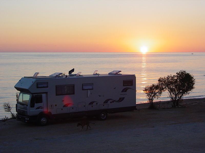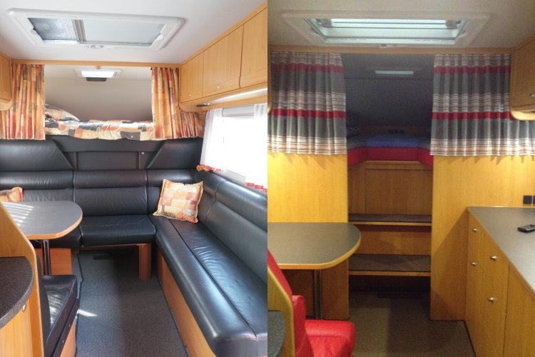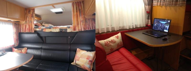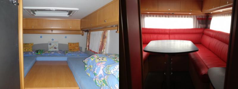 2002: Die Innenraumaufteilung und der Ausbau sind nach unseren Plänen individuell gefertigt: z.B. Heckgarage mit 3 darüber liegenden Betten in Hufeisenform als abteilbares Kinderzimmer. Gegenüber der Norm breiteres Tischblatt bei der Dinette, ausziehbar auf volle Breite zur gegenüberliegenden Sitzbank, die auch verlängert ist, etc.