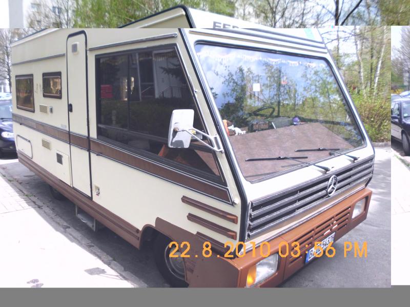 Das WoMo ist weitestgehend in Originalausstattung von 1980, d.h.: Cramer Gasgrill, Cramer Dunstabzugshaube, Truma Gasheizung, Electrolux Kühlschrank, Cramer 3-Flammen Gasherd mit Spüle, Atwood Warmwassergerät, Trumatic 3002 SL Heizung, LPG Autogasanlage. 50 l Grauwassertank für die Naßzelle und 50 l Grauwassertank für die Spüle, dazu 95 l Frischwassertank. Ich habe das Fahrzeug am 28. Januar 2013 erworben und den ganzen Winter über innen restauriert. Durch die Heizung war das kein Problem, die Temperaturen im Inneren waren so, dass ich es mir erlauben konnte die Dachfenster zu öffnen. Allerdings war es doch ab Minus 8 Grad sehr Fußkalt. Das Fahrzeug soll eine Laufleistung von 112000 km haben, was der Tatsache entsprechen kann, da es 15 Jahre abgemeldet war. Leider habe ich keine Unterlagen zum Aufbau bzw. zum Basisfahrzeug erhalten und musste mir alles mühsam über DB und das Internet zusammensuchen. An Reparaturen fiel einiges an, was aber mehr oder weniger dem Aufbau und dem Erhalt diente. So wurde das Motoröl und Ölfilter erneuert und MOTUL CLASSIC OIL SAE 15W-50, HALBSYNTHETISCH verwendet. Der gesammte Unterboden wurde wo nötig entrostet, gereinigt und mit Owatrol versiegelt. Die Aussenhaut wurde wo nötig mit Alublech ausgebessert und auch die Holzkonstruktion wurde, wo nötig, erneuert. Die gesamte Inneneinrichtung wurde gereinigt und das Holz aufgearbeitet. Zu der maximalen Anzahl der Mitfahrer möchte ich nichts sagen, zum einem genügen uns 2 mit Sicherheitsgurte ausgestattete Sitze und zum anderen könnte man sich darüber streiten ob sich auf den seitlichen Sitzgelegenheiten weitere Personen befinden dürfen oder nicht - natürlich unter Beachtung des zul. Gesamtgewichtes. Aber das wichtigste: Man hat nicht nur ein Gefühl während der Fahrt in einem Schaufenster zu sitzen ( Superübersicht), auch im Wohnbereich hat man ausreichend Platz. Ist der Tisch runtergeklappt und sind die Polster zur Liegefläche gelegt, hat man ein Bett schlaaafen von Sage und Schreibe 2,10 x 2,00.