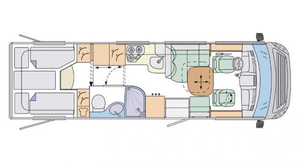 Das Fahrzeug gehört zu den schönsten Modellen, die Concorde bislang gebaut hat. Vor allem die gelungene Einteilung ohne Großraumbad verschafft ein perfektes Raumgefühl mit einer klaren Gliederung zwischen Wohn- und Schlafbereich. Die Liegefläche ist üppig und in zwei Einzelbetten unterteilt, welche einen einfachen Zugang ermöglichen. Die Küche mit einer Mineralstoffplatte und eingelassenem Waschbecken ist hochwertig. Drei große Schubladen, plus separater Besteckschublade sind praktisch angeordnet. Die Sitzgruppe reicht bequem für vier Personen, wobei auch bis zu sechs Erwachsene Platz finden. Der 22“-TV versteckt sich tagsüber in einem Seitenschrank und fährt auf Knopfdruck in angenehme Sichthöhe.