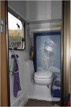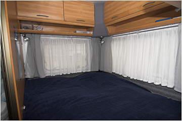 Rundsitzgruppe im Bug, Längsbett (Festbett) im Heck mit neben liegendem Bad