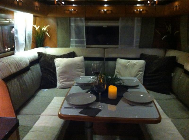 | Heckrundsitzgruppe, Hubbett quer im Bug. | Raumaufteilung (Halbdinette, Stockbetten?) |