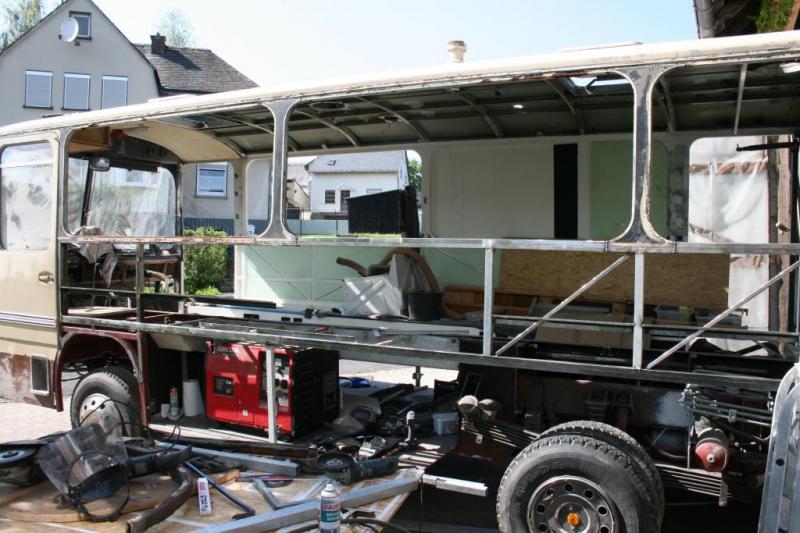Großbaustelle, arbeite derzeit gefühlt an allem: Winter 2014/15: Kernsanierung wg Wasserschaden im Heck von durchgerostetem Heckfenster, Fensterrahmen 2013 erneuert. Jetzt wird von hinten nach vorne entkernt und erneuert. Alles raus bis auf Blech/Träger, isolieren, erneuern. Sommer 2014 Kofferraum (2,6m*2,2m) komplett entfernt und neu eingeschweißt, Blechboden und Seitenwände gegen Siebdruck getauscht, Radlauf vo. li. erneuert.