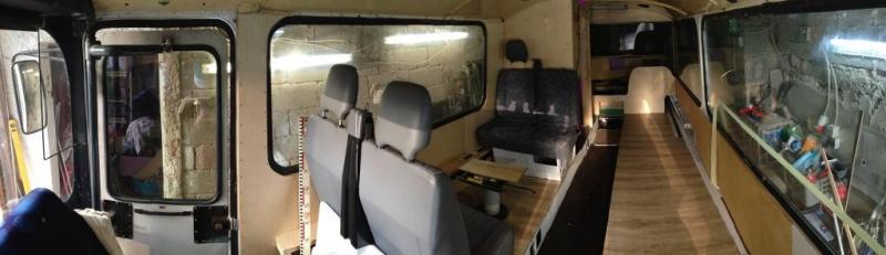 Aufteilung: Heckbett über gesamte Breite (2,1m), darunter Stauraum. Rechts davor Toilette/Waschraum - z.Z. leer mit Porta Potti. Davor z.Z. drei Sprinter Doppelsitzbänke mit Dreipunkt/Zweipunktgurten, die zwei hinteren als Dinette, darüber auf voller Länge Hochschrank. Vorne einzelner Reiseleitersitz. Nur 4+1 Sitz eingetragen, weitere Eintragung war geplant; mal sehen, unser Großer ist jetzt 18, ggf Rückbau einer Sitzbank. Links schmaler Kleiderschrank, davor Küchenzeile bis zum Fahrersitz, darüber ebenfalls Hochschrank. Küchenzeile mit 4flammigen Gasherd, Spüle mit Abtropffeld, Kühlschrank, Unterschränke, Schubladen.