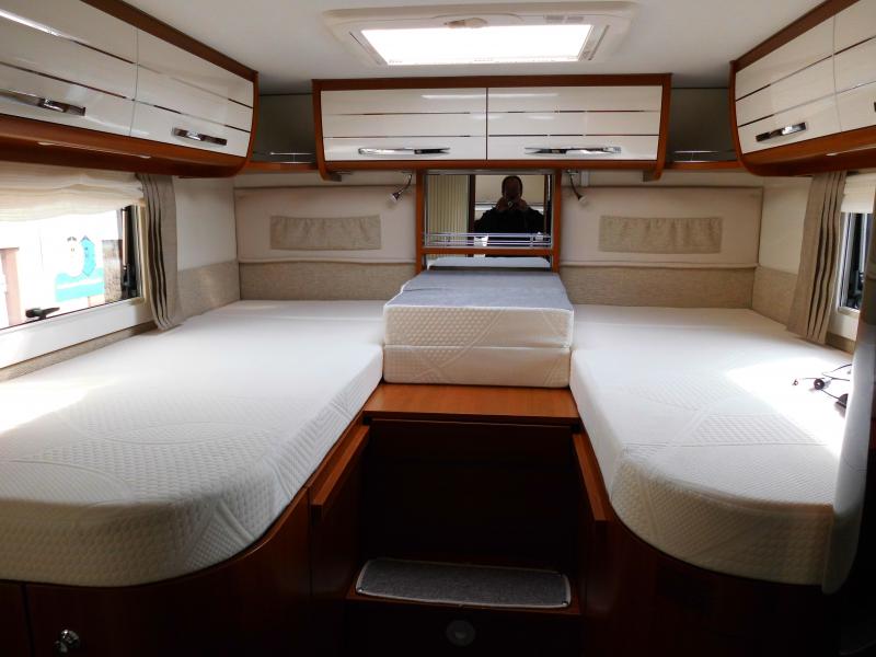 | Hinten Einzelbetten, Klappbarer Alkoven, Vordersitze drehbar | Raumaufteilung (Halbdinette, Stockbetten?) |