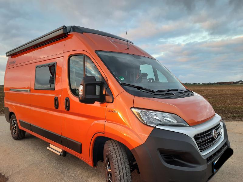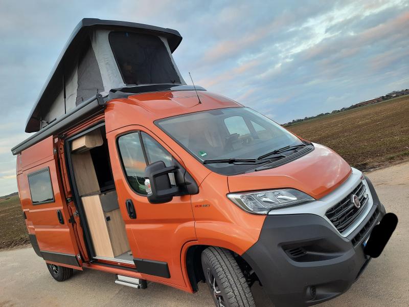 Metalliclack new batic orange Automatikgetriebe Fiat , 9 Gang Wandler Automatik, Schlafdach / Aufstelldach in schwarz-matt lackiert Sitzbezüge Leder, Lenkradfernbedienung, Radio Doppel DIN Rückfahrkamera AHK Fahrradträger Hecktür zusätzliche Lampen und zusätzliches Seitenfenster hinten links (Fahrerseite) Trittstufe Schottwand Markise Heizung unter Sitzbank Abwassertankheizung sowie die Serienausstattung Modelljahr 2021