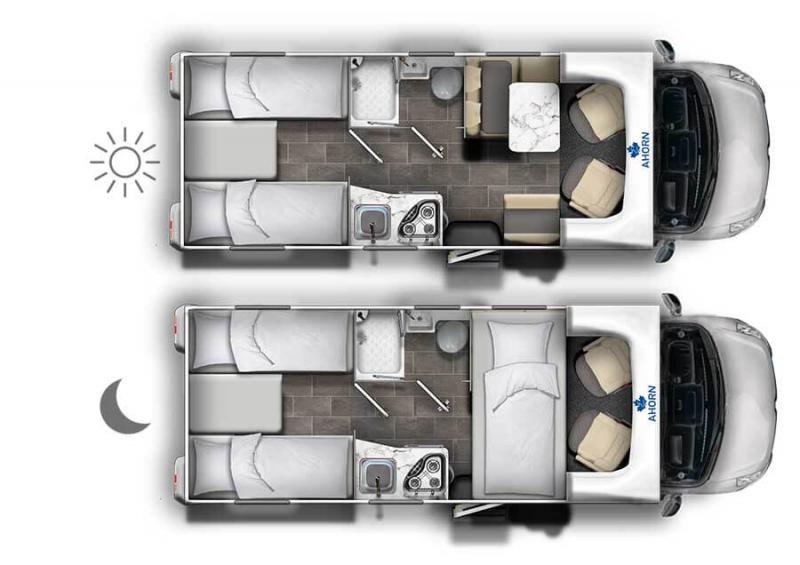| Längsbetten, Hubbett, Dinette umbaubar | Raumaufteilung (Halbdinette, Stockbetten?) |