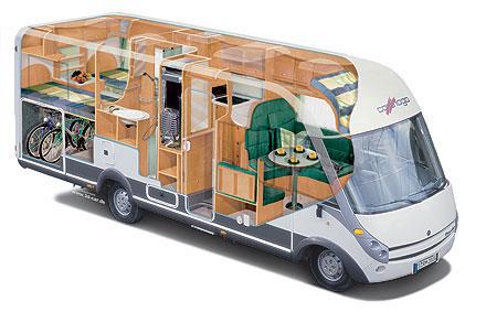 | Halbdinette, Hubbett, Doppel-Heckbett längs, Bad m. sep. Dusche, Quad-Garage | Raumaufteilung (Halbdinette, Stockbetten?) |