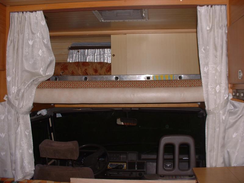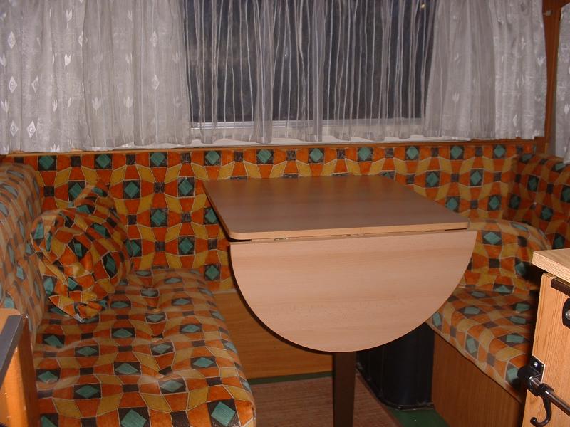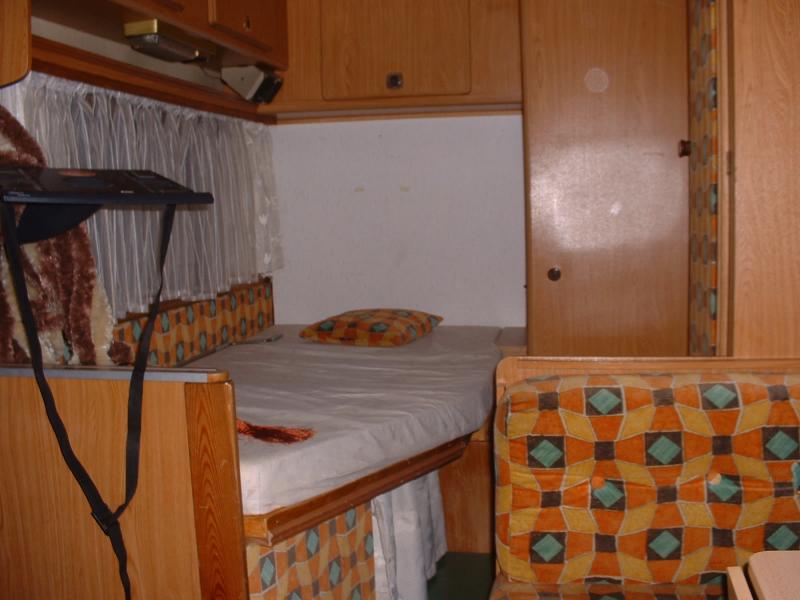 | Alkovenbett, Doppelsitzgruppe mit Tisch, Einzelbett mit Lattenrost im hinteren Bereich | Raumaufteilung (Halbdinette, Stockbetten?) |