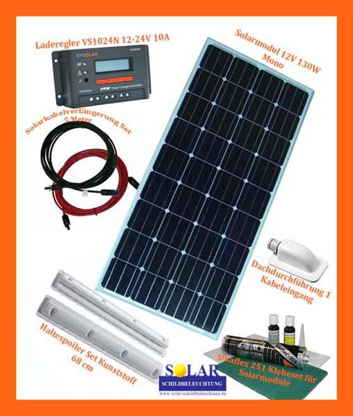 Bausatz beinhaltet: 1 x Solarmodul 130Wp 1 x Laderegler 10A 1 x Modul-Anschlußset 5 Meter mit angepressten C4 Steckern 1 x Haltespoiler Set Kunststoff 68 cm 1 x Dachdurchführung (1Kabel) 1 x Montagekleber Set