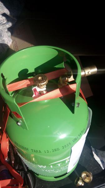 Die Flasche wiegt 12,2kg, ist Baujahr 2015, hat Prüfung bis 2025.