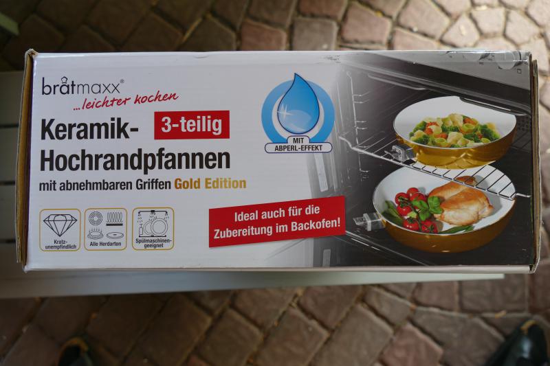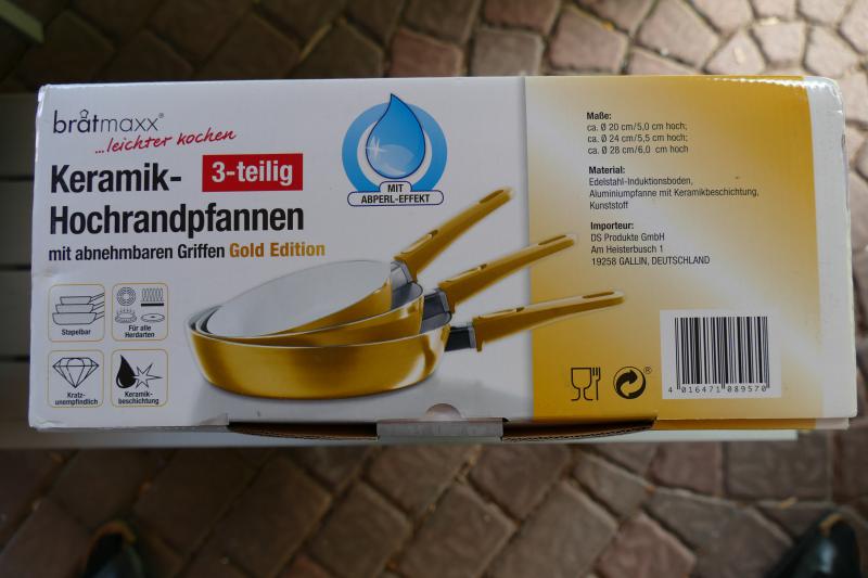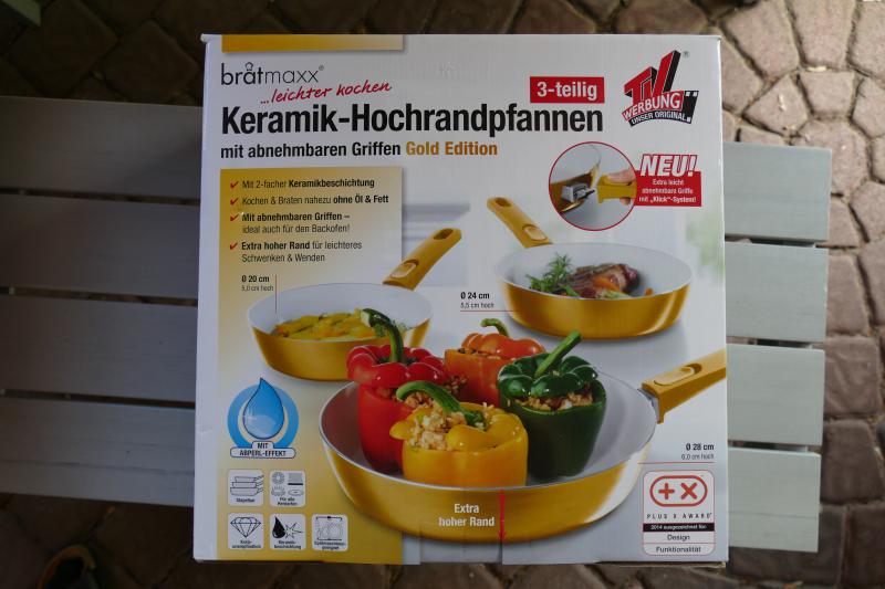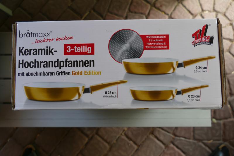 ich biete hier ein unbenutztes Set Keramik-Hochrandpfannen in der Gold-Edition von Bratmaxx. Die Pfannen haben abnehmbare Griffe und sind dadurch ideal für den Einsatz im Reisemobil geeignet, da sie so nur wenig Platz im Schrank einnehmen.