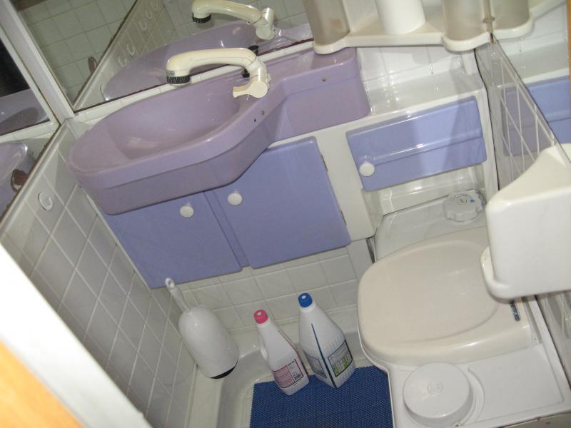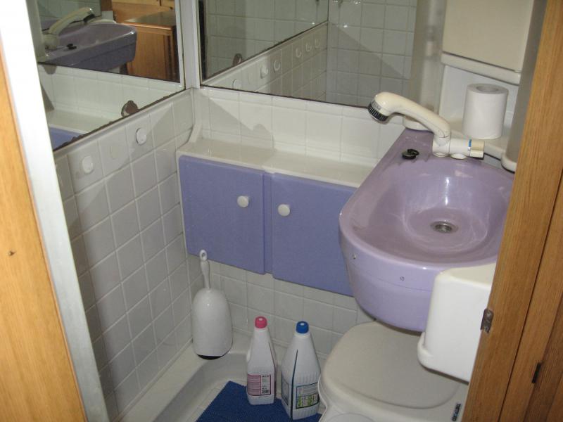 In der Nasszelle befindet sich eine Thetford Cassette Porta Potti C2 mit 15 l Frischwassertank und 20 l Abfalltank. Das Waschbecken kann zum Duschen platzsparend über die Toilette gedreht werden.