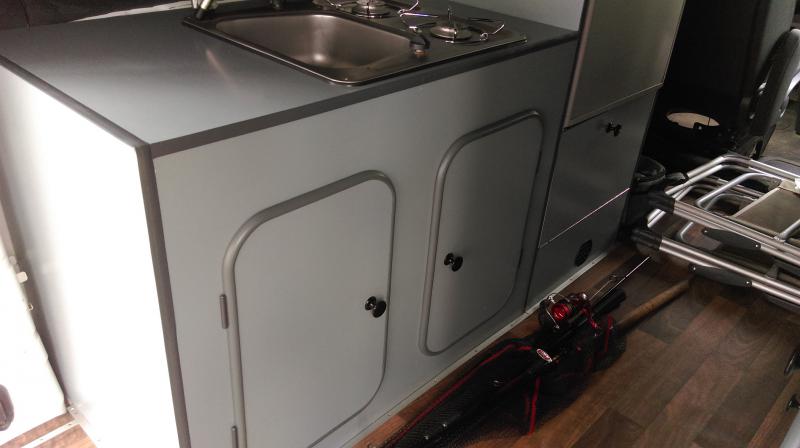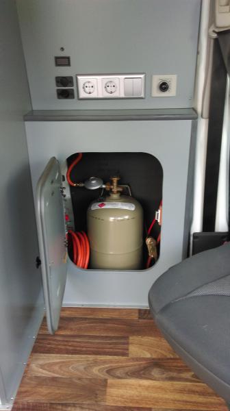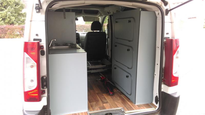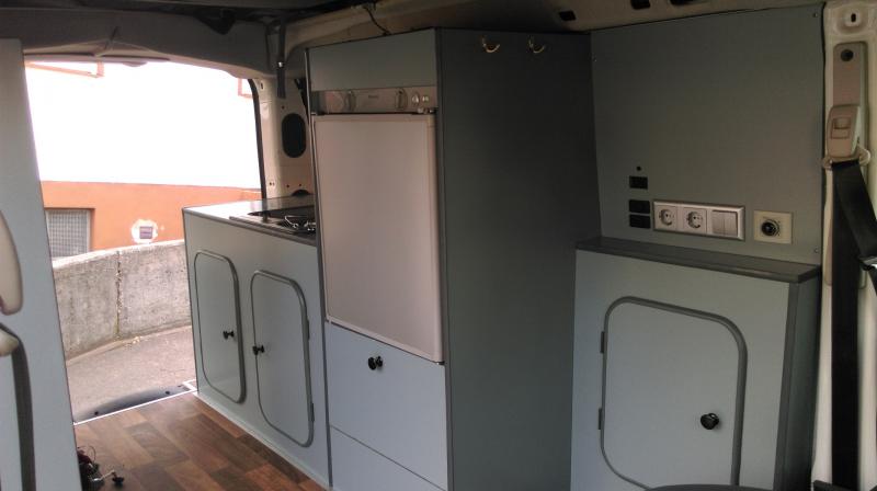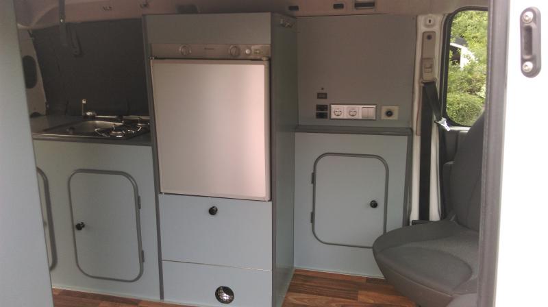 - Fahrzeug vor Ausbau vollisoliert mit Extreme-Isolator - stabiler Sortimo-Boden als Grundlage - Spüle mit elektrischem Wasserhahn (2x10l Tanks Frisch-/Abwasser) - 2-Flammengaskocher Dometic - 60l Kühlschrank Dometic mit Eisfach, Betrieb wahlweise mit 12V, 230V und Gas - 2,4kw Gasheizung Truma E2400 über Thermostat und mit Funkfernbedienung - Gasanschluss für Gasgrill - vorschriftsgemäßer Gaskasten für 5kg Gasflasche - Außensteckdose mit CE Anschluss für 230 V + Zusatzsteckdose normal - Fahrer- und Beifahrersitz mit Drehsitzkonsolen (180°) von ZOOOM - Aufstelldach Fa. ZOOOM in Wagenfarbe mit Bettfunktion Aus GfK mit frontseitigem Anschlag und verdeckter Anlenkung, lackiert in Wagenfarbe. In der Frontnase ca. 100 l zusätzlicher Stauraum z.B. für Bettzeug. Bett mit Lattenrost, Schlaffläche 1,35 × 2,20 m. Leiter zum Aufsteigen ins Dach. Matratzenstärke 6 cm, Bezüge abnehmbar aus Mischgewebe, Spannbetttücher. Volle Stehhöhe im Fahrzeuginneren Zeltbalg mit zwei Lüftungsfenstern mit Moskitonetzen zum Öffnen. Vollisolierung des Aufstelldachs inkl. Seitenwände bei ZOOOM erhältlich Zugelassene Dachlast: 50kg liegend