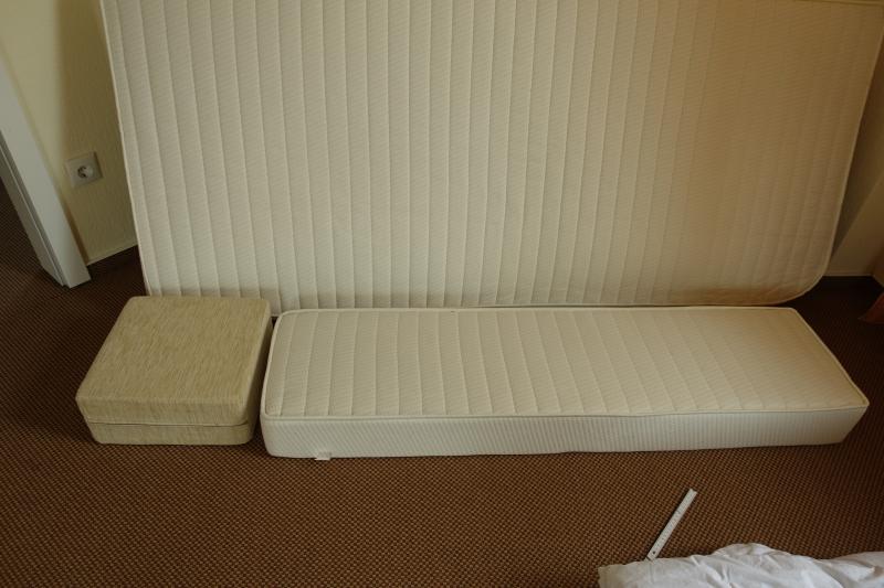 Die Matratzen stammen original aus einem Knaus 800leg Maße: 194cm x 84cm rechte und linke Matratze Mittelteil um ein Doppelbett zu bauen: 140cm x 35cm plus Würfel 35cm x 35cm mit Stoff bezogen.