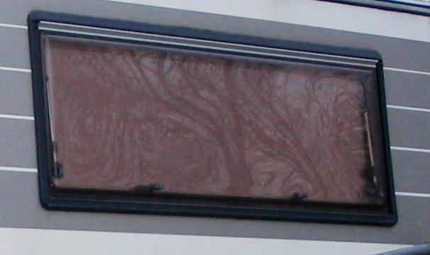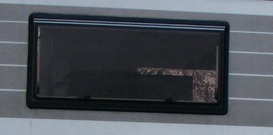 Die Scheiben ist bräunlich getönt. Der Außenrahmen ist schwarz und der Innenrahmen beige. Die Schraubenkappen sind nicht vorhanden.