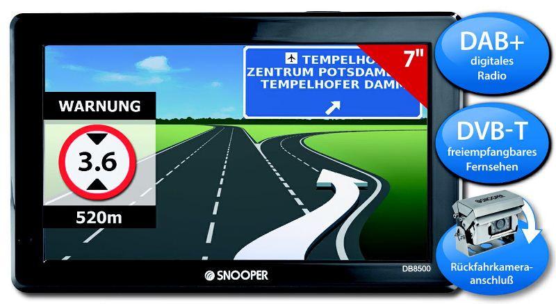 Beinhaltet ist sämtliches Zubehör wie: Snooper Ventura DB8500 PRO SOUND Portable Satellite Navigation System Micro-SD-Karte mit NAVTEQ-Europa-Kartenmaterial 12/24V Ladegerät für Zigarettenanzünder 100-240V Netzladegerät Windschutzscheiben-Saugnapfhalterung (360° verstellbar) inkl. Halteplatte für fahrzeugspezifische Adapter USB Kabel TMC-Antenne DVB-T-Antenne CD-Rom mit Software zum Download der Radargerätewarner-Updates Quick-Start-Bedienungs- und Einbauanleitung |
