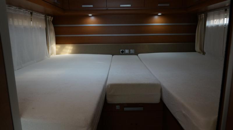 Innenausstattung Festbett, Navigationssystem, Rundsitzgruppe, Servolenkung, TV, Tempomat, WC, Zentralverriegelung, Außenausstattung Heckgarage, Markise, Solaranlage