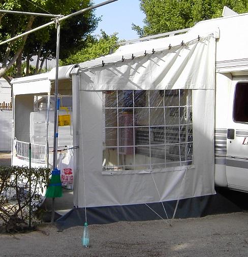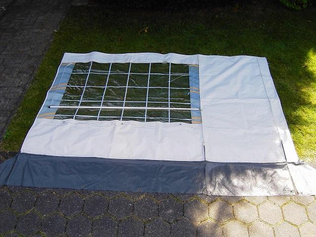 Markisen Vorzelt für Fiamme F45 oder Omnistor 5002 Markise. Bestehend aus: Vorderwand 2,70m lang, Zwei Seitenwänden (Masse s. Skizze), Gardinen, Tür, drei Fenster, (Fenster vorn, aufklappbar). Material: All Waether Text UV beständig. Mit allen nötigen Materialien: Je zwei seitl. Spann- und Stützstangen, Fensterstange, Erdnägel, zusätzliche Klammern zu dem Clipssystem, Montageanleitung Vorzelt ist im guten Zustand |