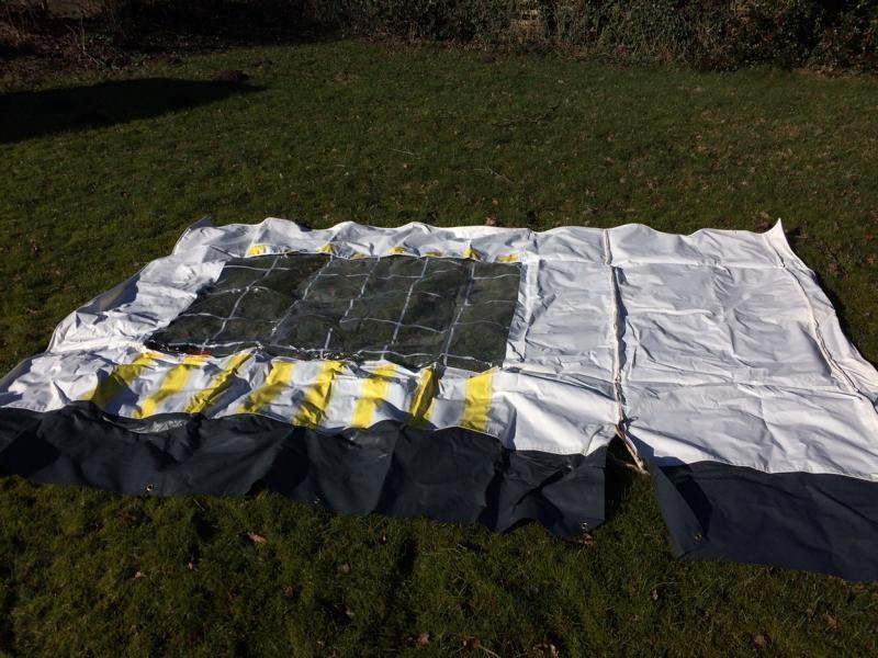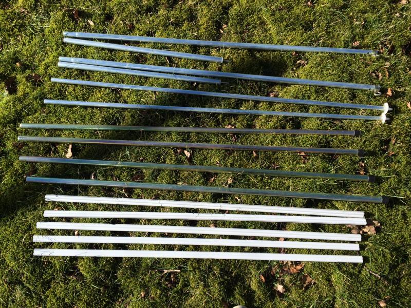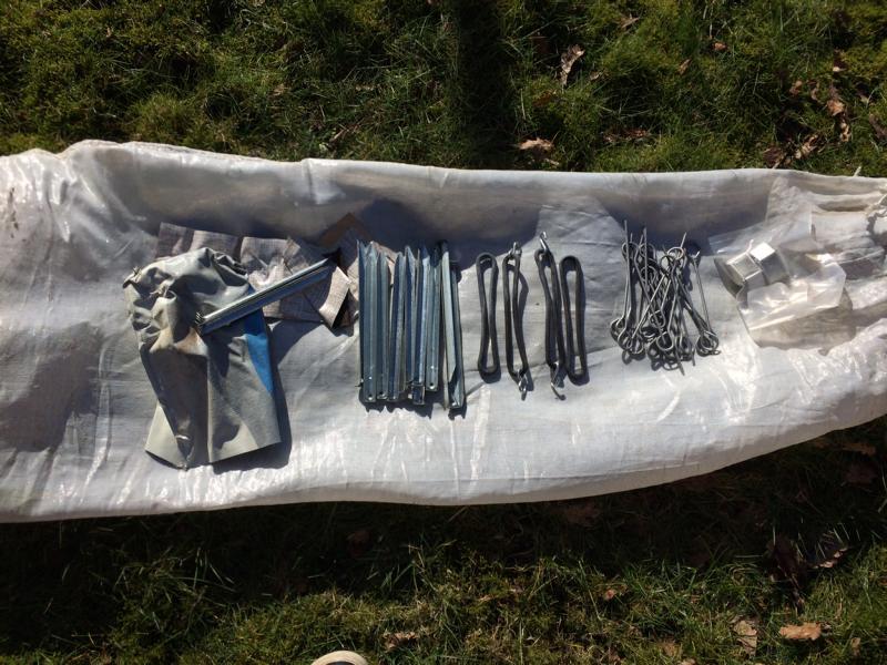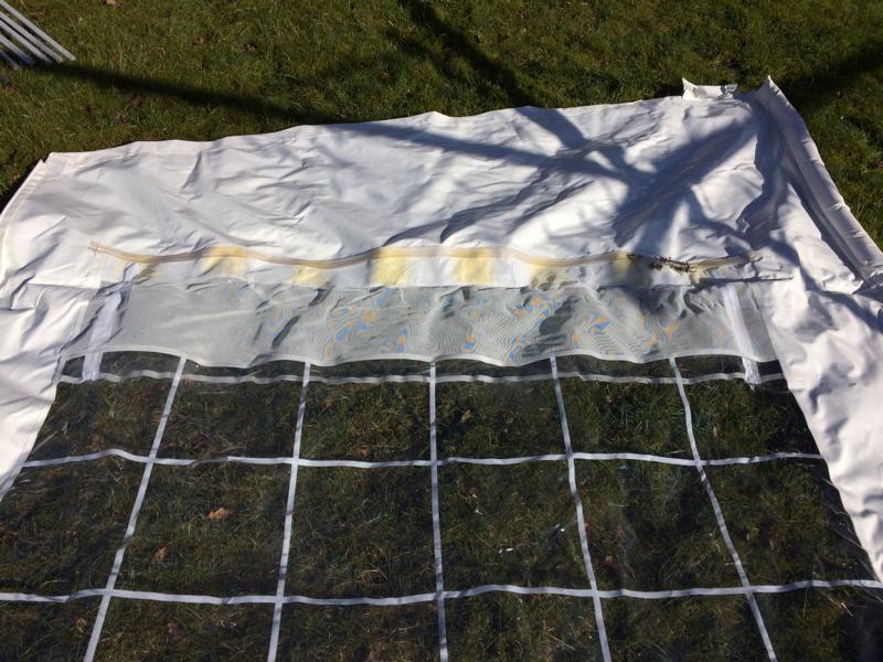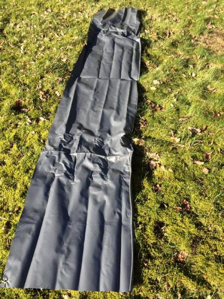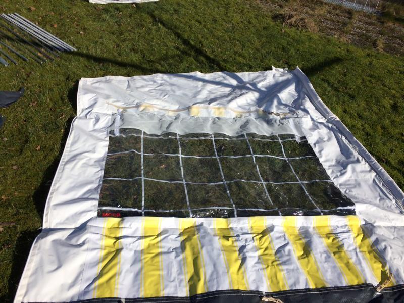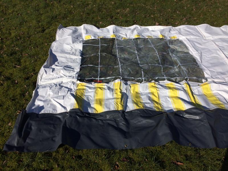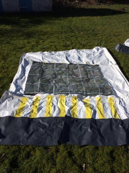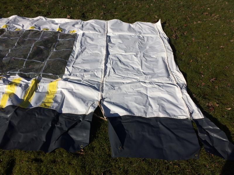Die Maße - mit dem Zollstock im liegenden Zustand gemessen: Frontteil 316cm breit, 200cm hoch, zzgl. 38cm Schürze Seitenteile 200cm breit, vorn 206cm, hinten 258cm hoch, zzgl 38cm Schürze Schürze 339cm breit, 64cm hoch 19 Heringe und 23 Erdnägel sind dabei. |