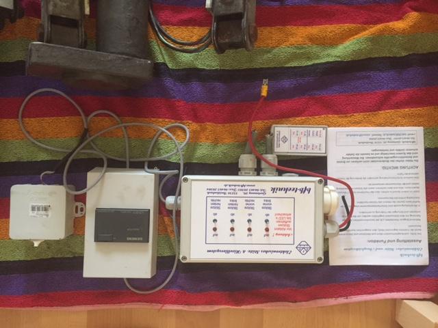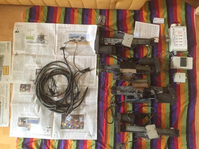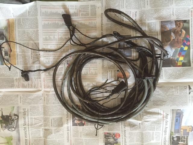 Beim Ausbau durch die Werkstatt wurden die Kabel zur Steuerung einfach abgeschnitten (s. Bild von der Steuerung), müssten also verbunden oder neu in der Steuerung angeschlossen werden. Der Kabelbaum ist komplett und die Stützen teilweise mit Unterbodenschutz "beschmutzt" (aufgrund der Unterbodenversiegelung vom Womo), d.h. die Kabel sind "dreckig" und klebrig.