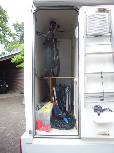 In der fahrzeughohen und -breiten Garage ist genügend Stauraum für Fahrräder, Campingmöbel, etc.