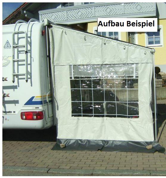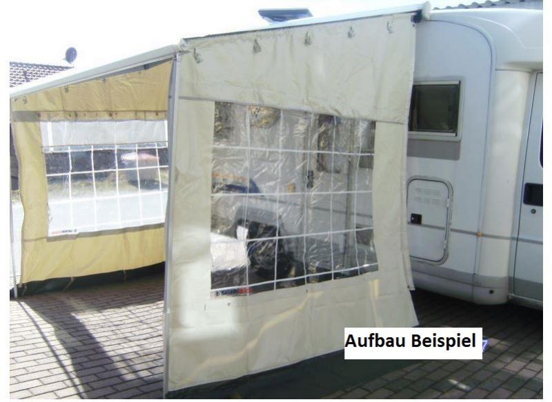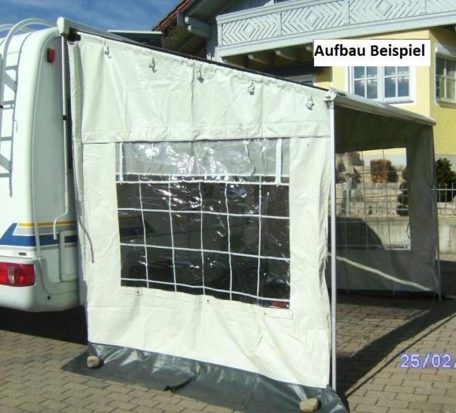 Abmessungen Seitenwände 2 teilig: Tiefe = 230 cm (von Markisenfront zum Fahrzeug) Höhe = 200 cm ( an der Markisenfront) Höhe = 250 cm (an der Fzg.-Seitenwand) Graue Schürze ca. 40 cm
