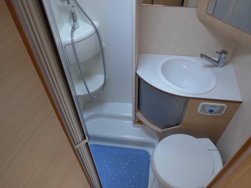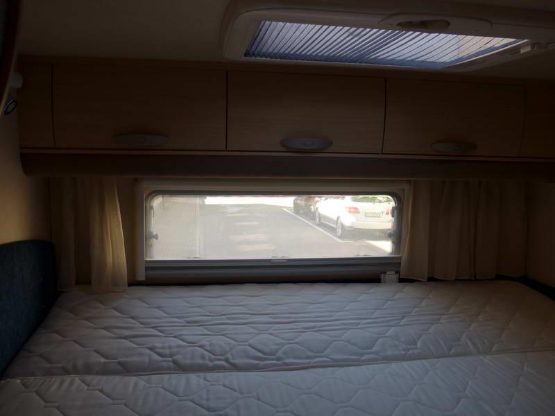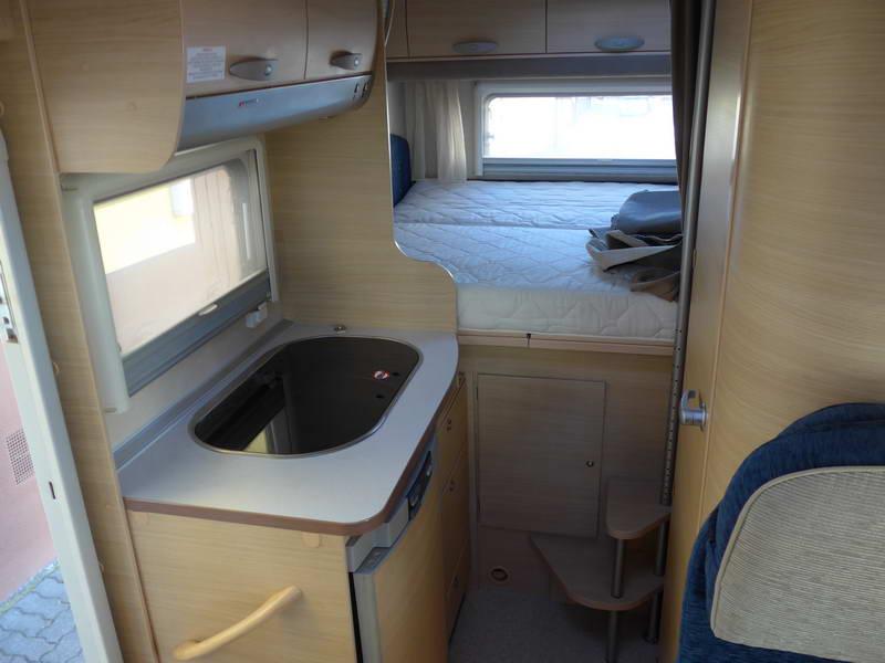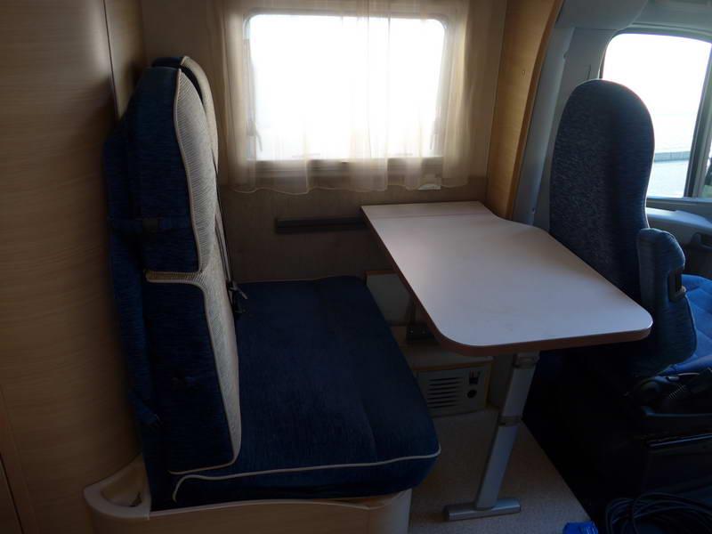 Wohnraum: 4 Sitzplätze (Fahrer, Beifahrer und 2 auf der Bank) mit Gurt + 1 weiterer Sitzplatz ohne Gurt, Fahrer und Beifahrersitz drehbar, Aufbautür (mit Zentralverriegelung) Querbett / Doppelbett im Heck (198x140/130), Dinette umbaubar mit Zusatzbett (168x100/50), 5 Sitzplätze um den Tisch herum, unter dem 5. Sitz ist ein kleines Ablagefach, Zusatzheizung, Dachfenster, Fernseher (21“, Schwenkarm der bis zur Dinette reicht), Sat-Anlage Oyster Caro, 3-flammiger Gasherd, Dunstabzugshaube, Spülbecken, Kühlschrank mit Gefrierfach (12 V, 230 V, Gas), 3x 12V-Steckdose, 3x 230V Steckdosen, Rollo-Alarmanlage mit Gaswarner, Truma 4 Heizsystem, sehr viel Stauraum (11 Klappen, 1 Kleiderschrank – mit ausziehbarer Stange für Kleiderbügel), 2 Schubladen, 2-etagiger Stauraum unter dem Bett, Bettkasten, kleines Ablageschränkchen (beim Bett), großes Fenster über dem Bett, übersichtliches Anzeigentableau (Wasserstand für Brauch- und Grauwasser, Batterie Aufbau und Fahrzeug, Hauptschalter, Ein/Aus Wasserpumpe), Aufbaubatterie = Gel, 1 Jahr alt, Teppich, Schuhfach/schrank