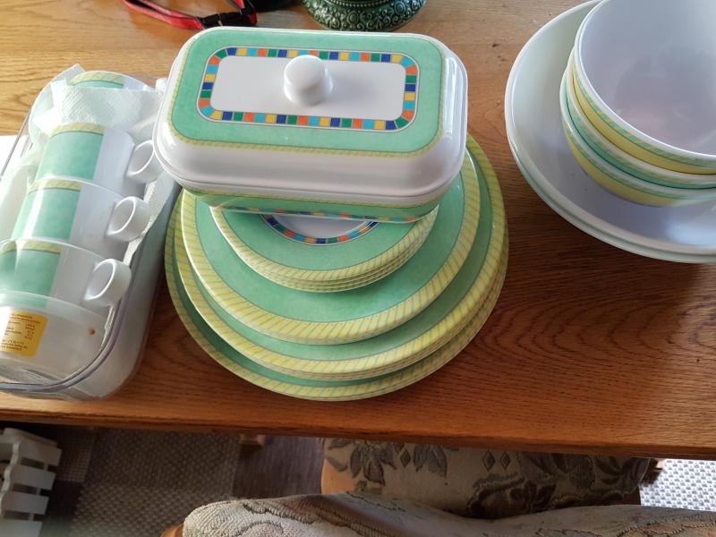 Verkaufe sehr gut erhaltenes Melamin Geschirr 4 tiefe Teller, 4 flache Teller, 4 Frühstücksteller 4 Tassen, 4 Untertassen, 1 Butterdose 3 Schalen 14 cm, 2 Schalen 21cm.