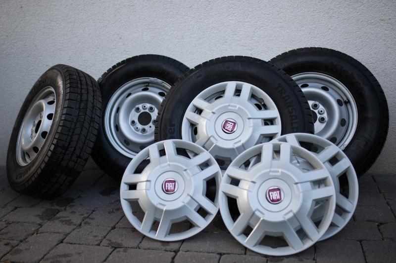 4x Reifen der Modell Transalp 2 der Firma Kleber, Größe 215/70R15C, Tragfähigkeitsindex 109 (1030kg), Profiltiefe ca 8-9mm, 44. KW 2015 4x Stahlfelgen (6JxH152, ET68, Lochkreis 5x118) 4x Radkappen Original FIAT