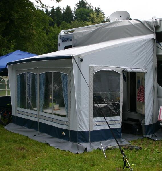 Gebrauchtes Vorzelt fürs Wohnmobil in absolut einwandfreien Zustand. Wir haben das Vorzelt in den letzten 2 Jahren 4x aufgebaut und regelmäßig gesäubert. Es ist "sturm- und regen-erprobt", daher können wir diesem Zelt von der Qualtität her nur eine glatte "1" erteilen. Weder ein Sturm in Dänemark noch 1-wöchiger Dauerregen konnten dem Zelt etwas anhaben. Hier die Herstellerangaben: Für Reisemobile von 250 – 300 cm Höhe; bis 275 cm Türöffnungshöhe. Material: Dach aus trailtex, außenseitig beschichtet und abwaschbar; Wände aus trailtex-Gewebe, atmungsaktiv, extrem reißfest und abwaschbar. Vorder-/Seitenwände: senkrecht und vierteilig, alle Wandteile herausnehmbar und gegeneinander tauschbar; zwei Eingangsmöglichkeiten: Tür an jede Position versetzbar und hochrollbar; mit Lüftungsfenster (Gaze/Folie), durch Prägefolienklappe mit Reißverschluss verschließbar; waagerechte Hohlsäume für Sturmstangen. Rückwand: fest vernäht, teilbar und einzeln hochrollbar. Lieferumfang: Zelthaut, Gestänge, Gardinen, Abspannleinen, Erdnägel, Packsack.
