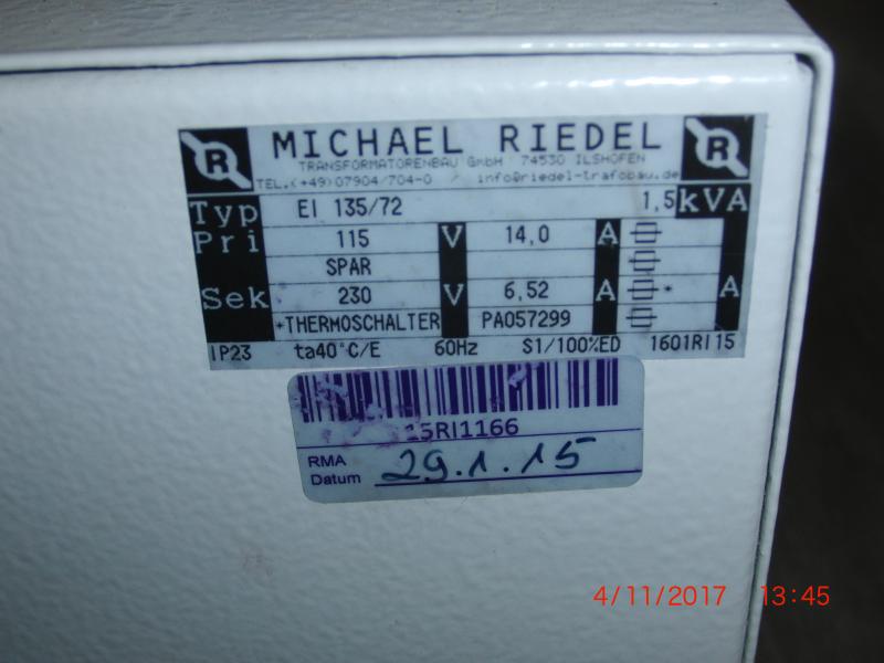 | Beschreibung: | Wir, meine Frau und ich, haben von Mai 2015 bis Mai 2016 Nordamerika bereist und diesen Spannungswandler benutzt. Da wir diesen nicht mehr benötigen, möchte wir den Spannungswandler hier im Forum verkaufen. Der Spannungswandler arbeitet einwandfrei und hat uns sehr gute Dienste erwiesen. Hier technische Details. Herst.: Michael Riedel Typ.: EL 135 / 72 Leistung: 115 V >>> 230 V 60 Hz Thermoschaltersicherung |