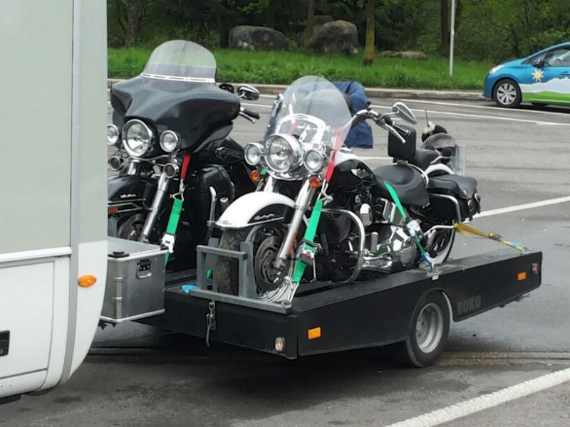 Der Hänger ist sehr handlich und läuft sauber hinterher. Bilder findet ihr in der Galerie. Ich transportiere problemlos eine E-Glide und eine Softail DeLuxe mit dem Hänger. Jede Seite lässt sich separat abkippen und ist jeweils mit einschiebbaren Auffahrschienen versehen. Die Motorräder können alleine verladen werden. Eine sichere Auffahrt auf den Hänger ist durch die Schienen problemlos möglich. Der Kippmechanismus ist mit Stoßdämpfern abgesichert. Verstellbare Vorderradklemmen sind montiert, Zurrösen vorhanden.