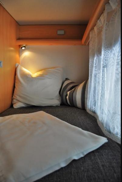 Wohnkabine vollintegriert Aussenmasse 595cm x 230cm x 290cm 3 Schlafplätze Hubbett 200cm x 160cm / Heckbett 190cm x 80cm Beleuchtung LED Garage 220cm x 85cm x 130cm mit beidseitigem Zugang Gasfach mit Platz für 2 x 7 Kg Kunststoff Gasflaschen Frischwassertank 120 Liter (beheizt vom Wohnraum zugänglich) Abwassertank 100 Liter (unbeheizt)
