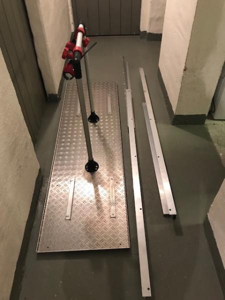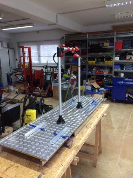 Aktuell sind die Schwerlastauszüge von der Bodenplatte abgeschraubt. Diese müssen nur an der Unterseite der Bodenplatte mit Schrauben in vorhandene Gewinde angeschraubt werden. Dann kann der Slider in der Heckgarage befestigt werden (geschraubt oder geklebt).