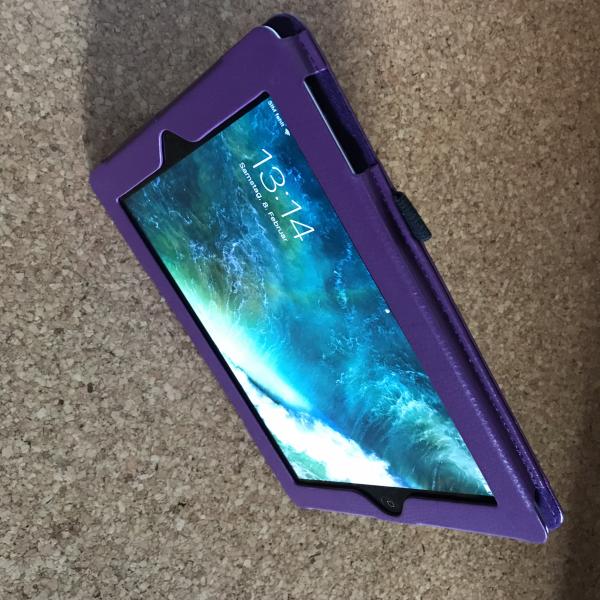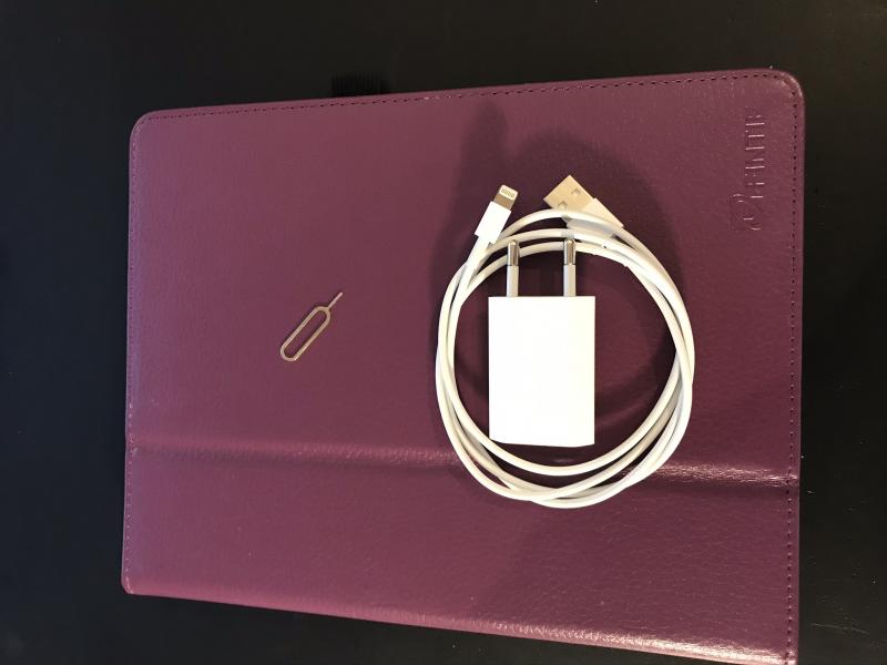Die Hülle ist violett, alle Anschlüsse sind auch bei geschlossener Hülle zu erreichen. Die Hülle kann als Pult oder als Ständer aufgestellt werden und verfügt auch noch über einen Stifthalter. Zusätzlich ist das Ladegerät und das Lightningkabel und das Werkzeug zum Öffnen des SIM-Fachs mit dabei.