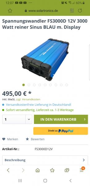 | Beschreibung: | Hallo, Habe noch diesen Neuen Spannungswandler von Solartronics . Wurde nur einmal zum testen angeschlossen, aber ist für unser neues Wohnmobil zu gross .