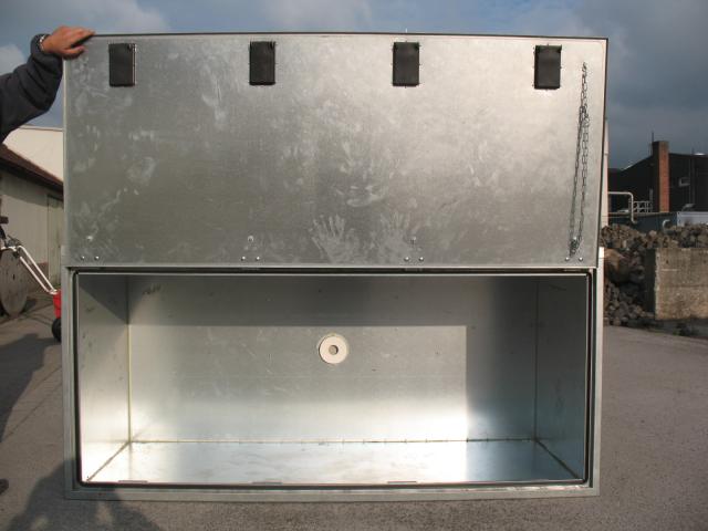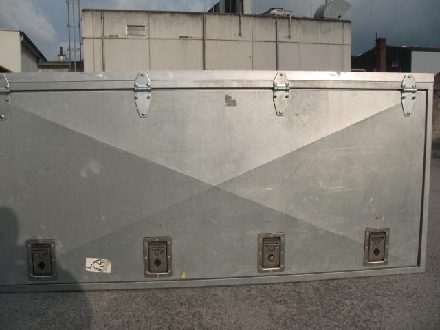 | Beschreibung: | Große, stabile Transportbox aus verzinktem Blech, wasserdicht, abschließbar. Maße: B=200 cm, T=84 cm, H=90 cm, Leergewicht ca. 60 kg, über die Gesamtbreite von unten nach oben zu öffnen, d. h. Klappe oben angeschlagen. Sie war auf meiner Motorradbühne / Plattform nur zweimal montiert, auf der Box war ein Fahrradträger montiert. Tel: 0209/875270. |