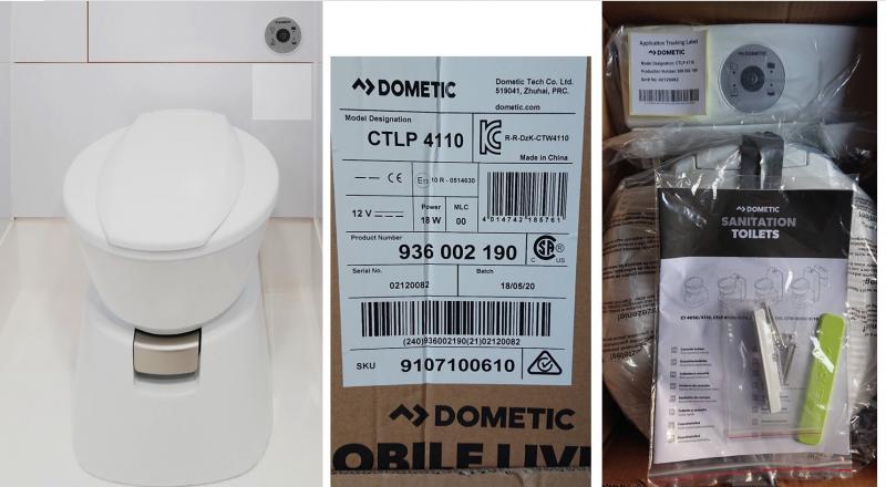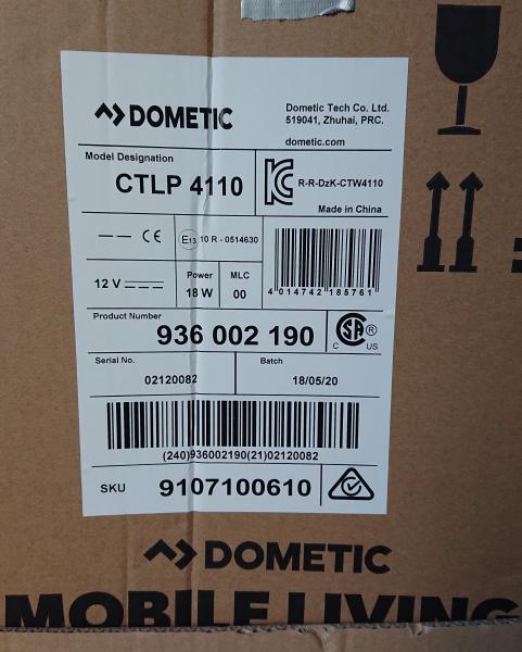 Dometic Modell CTLP 4110. Verpackt 18.5.2020. Produktnr. 936 002 190 Artikelnr./SKU 9107100610 Seriennr. 02120082